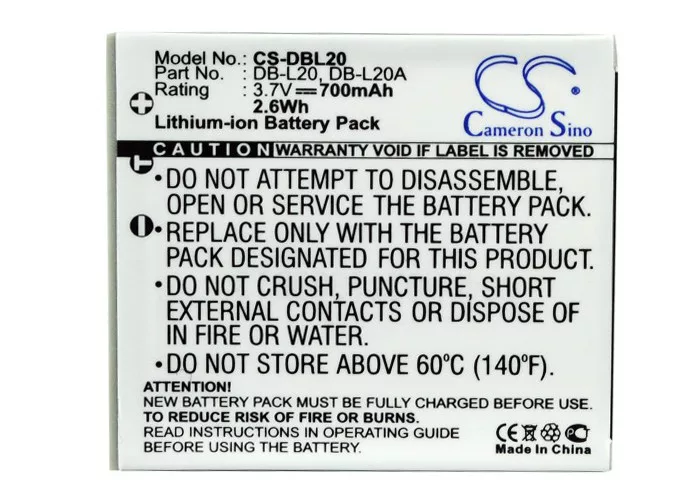 Sanyo DB-L20, DB-L20A helyettesítő akkumulátor (Li-ion, 3.7V, 700mAh / 2.59Wh) - Utángyártott
